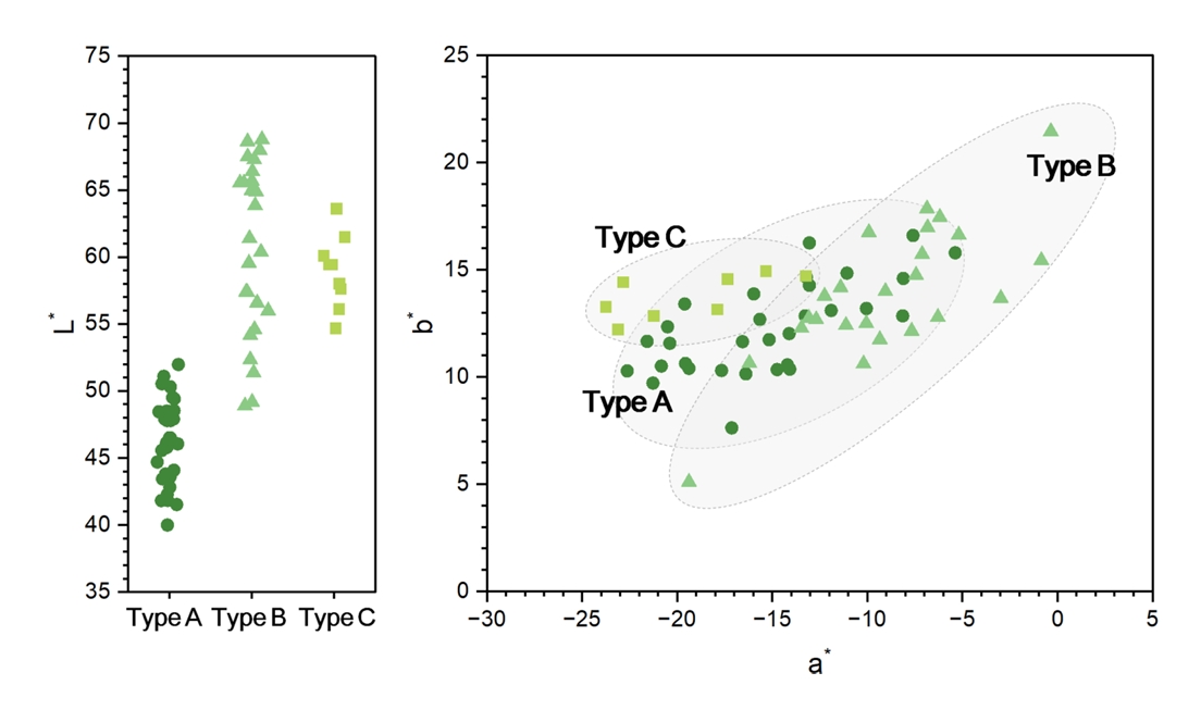 +a* 가 적색, -a* 는 녹색, +b*가 황색, -b*가 청색을 나타낸다. B 유형의 녹색 안료는 다른 유형에 비하여 상대적으로 색도의 분포 범위가