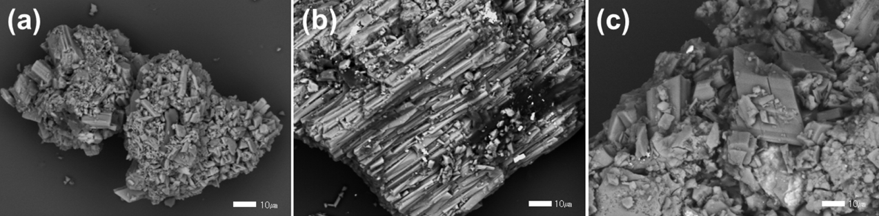 c 그룹은 입자 크기가 다양하며 판상(platy)이나 침상(prismatic) 결정들이 불규칙하게 응집된 형태 또는 바늘형(needle-like)