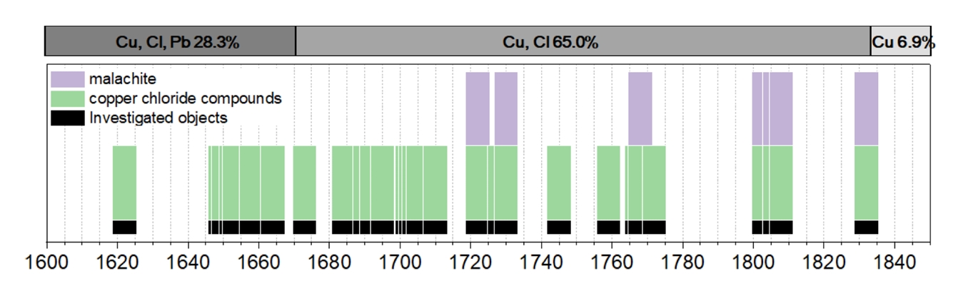 탄산염 광물인 공작석은 주로 18세기 이후의 대형불화에서 사용이 확인된다(그림 7).