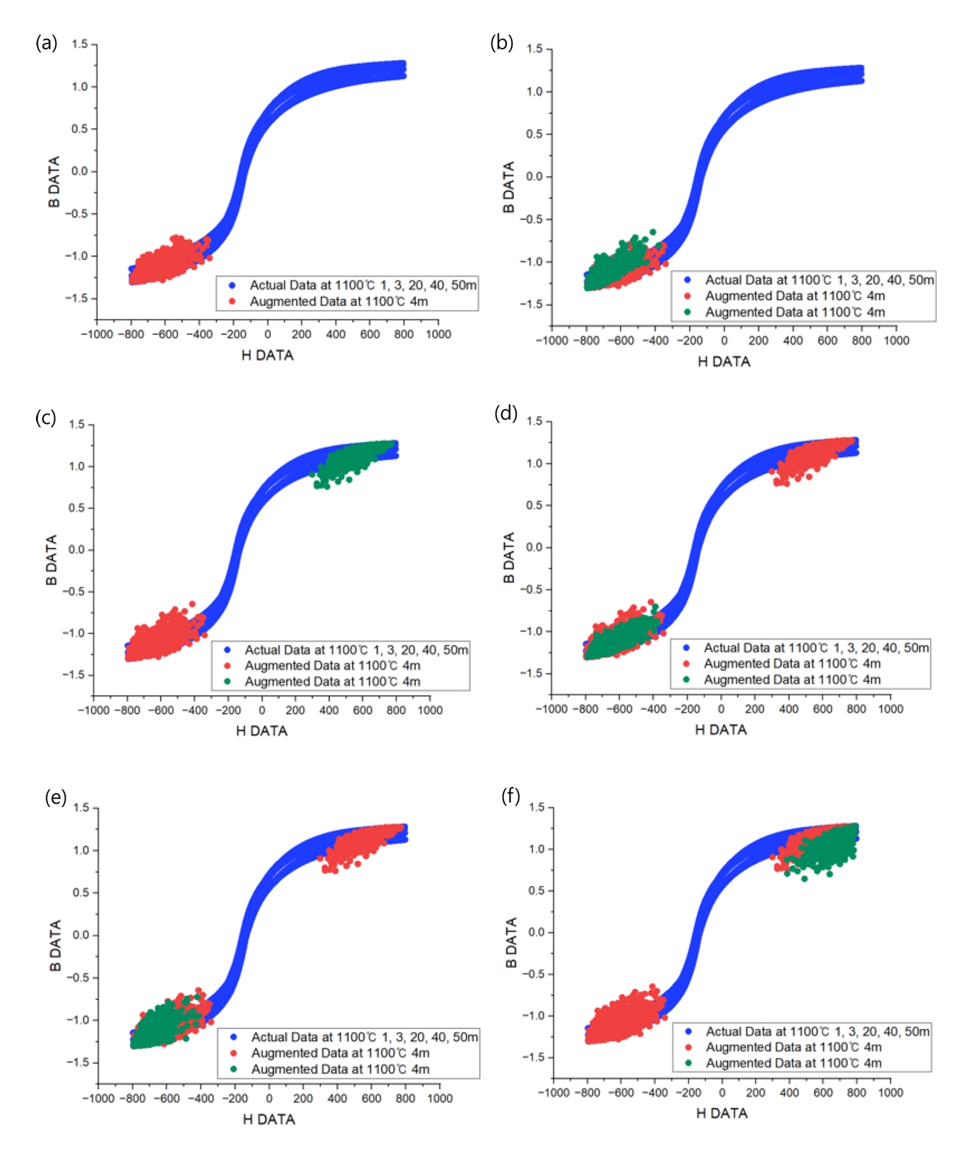 ๊ทธ๋ฆผ 7์ 1100ยฐC ์คํ ๋ฐ์ดํฐ ๊ธฐ๋ฐ์ผ๋ก ํ์ต๋ ๋ชจ๋ธ์ ๋ํด, GAN์ ํตํด ์์ฑ๋ ๋ฐ์ดํฐ๋ฅผ ์์ฐจ์ ์ผ๋ก ํฌํจ์์ผ ๊ฐ๋ฉฐ ํ๊ฐํ ๊ฒฐ๊ณผ๋ฅผ ๋ํ๋ธ๋ค. ์์ธก ์ฑ๋ฅ์