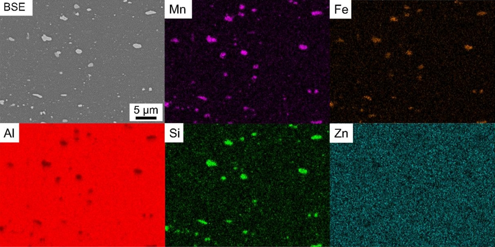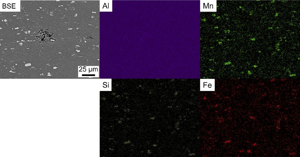 ๊ธฐ์ง(matrix) ๋ด์ AlโMnโFeโSi ๊ณ์ด์ ๊ธ์๊ฐ ํํฉ๋ฌผ(intermetallic compounds)์ด ์กด์ฌํ๋ ๊ฒ์ผ๋ก ์๋ ค์ ธ ์๋ค[5,6]. ๋ํ, BSE ์ฌ์ง์์ Si๊ฐ ํฌํจ๋์ง ์์ ๊ธ์๊ฐ ํํฉ๋ฌผ์ด Si๊ฐ ํฌํจ๋ ํํฉ๋ฌผ๋ณด๋ค ์๋์ ์ผ๋ก ๋ ๋ฐ๊ฒ ๋ํ๋๋ ๊ฒฝํฅ์ด ํ์ธ๋์๋ค. ๋ฐ๋ผ์