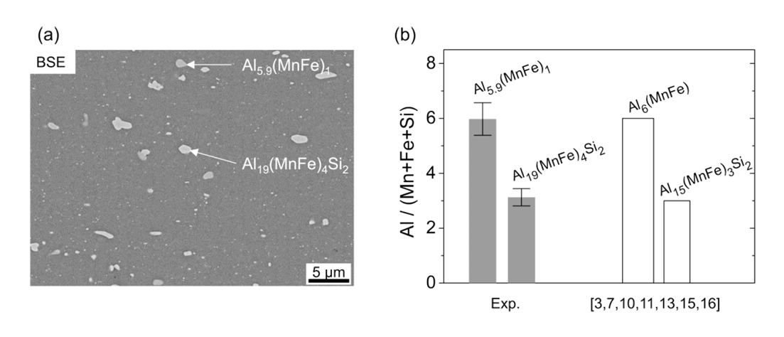 A93003 ํฉ๊ธ์ ํ์ฑ๋๋ ๊ธ์๊ฐ ํํฉ๋ฌผ์ ์ฃผ๋ก ๋ ๊ฐ์ง๋ก ์๋ ค์ ธ ์์ผ๋ฉฐ, ๊ทธ ์กฐ์ฑ์ ๊ฐ๊ฐ Al6(MnFe)์ Al15(MnFe)3Si2์ด๋ค[3,7,10,11,13,15,16]. ๋ณธ ์ฐ๊ตฌ์์ ๊ด์ฐฐ๋ ๊ธ์๊ฐ ํํฉ๋ฌผ์ ์๋์ ๋น์จ์ ๊ธฐ์กด ๋ฌธํ์์ ๋ณด๊ณ ๋ ๊ฒฐ๊ณผ์ ์ ์ฌํ ์์ค์์ ํ์ธํ์๋ค. ๋ฐ๋ผ์ ๋ณธ ์ฐ๊ตฌ์ ์ฌ์ฉ๋ UNS A93003