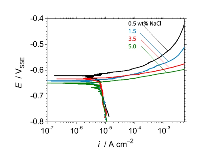 ๊ฐ๊ฐ์ NaCl ๋๋(0.5, 1.5, 3.5, 5.0 wt%)์์ ์นจ์ง ๋ ์ ๊ทน์ ๋ํด, ์นจ์ง ํ 2, 12, 24, 48, 120, 300 ์๊ฐ