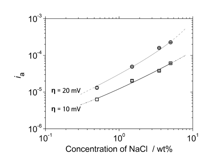 ๋ถ์ ์ ์(corrosion potential, Ecorr)๋ณด๋ค ์์ ์ ์ ์์ญ์ธ ํ์ ์์ญ์์๋ ์ ๊ทน ํ๋ฉด์์ ์ธก์ ๋ ์ ๋ฅ ๋ฐ๋๊ฐ ์๊ธ๋ฌผ ๋๋์ ํฌ๊ฒ ์์กดํ์ง ์๊ณ ์ ์ฌํ ๊ฐ์ ๋ํ๋๋ค. ์ด๋ UNS A93003