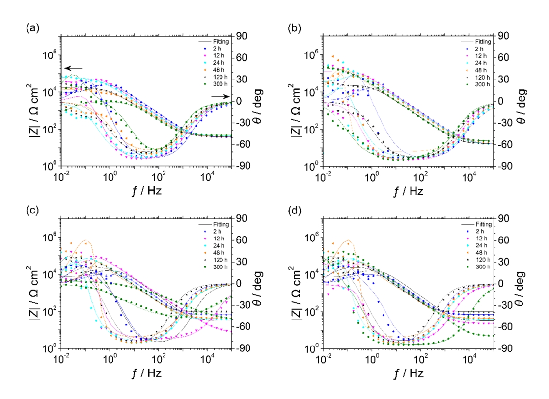์ฌ๊ธฐ์ Rf๋ ํผ๋ง ์ ํญ, Rct๋ ์ ํ์ด๋ ์ ํญ, Rs๋ ์ฉ์ก ์ ํญ, Rsurface๋ ํ๋ฉด ์ ํญ, RL์ ์ธ๋ํด์ค์ ์ ํญ์ ์๋ฏธํ๋ค. Bode ์ ๋์์ ๋ํ๋ ์ฃผํ์์ ๋ฐ๋ฅธ ์ ํญ ๊ฐ์ ์ ์ฃผํ ์์ญ์ผ๋ก ๊ฐ์๋ก ์ฆ๊ฐํ๋ ๊ฒฝํฅ์ ๋ณด์ธ๋ค. ๋ํ, UNS A93003