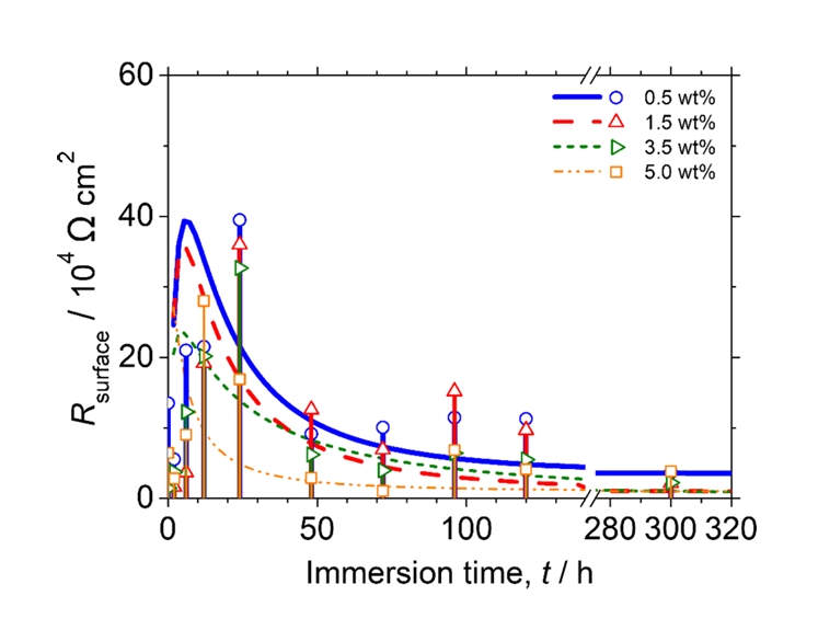 ๊ทธ๋ฆผ 8์ ํ๋ฉด ํน์ฑ์ ๋ํ๋ด๋ ๋งค๊ฐ๋ณ์ ์ค ํ๋์ธ ํ๋ฉด ์ ํญ(Rsurface) ๊ฐ์ด ์๊ธ๋ฌผ ๋๋์ ์นจ์ง ์๊ฐ์ ๋ฐ๋ผ ๋ณํํ๋ ์์์ ๋ํ๋ธ ๊ฒ์ด๋ค. ์ (scatter)์ผ๋ก ํ์ํ ๊ฐ์ ๊ณ์ฐ๋ Rsurface์ ์ค์ ์ธก์ ๊ฐ์ด๋ฉฐ, ์ (line)์ ํด๋น ๋ฐ์ดํฐ๋ฅผ ํผํ