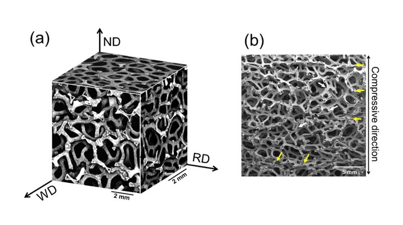 features, with sheet interface regions visible, as indicated by arrows in Fig 2(b). These regions contained intersected struts or struts undergoing bending deformation