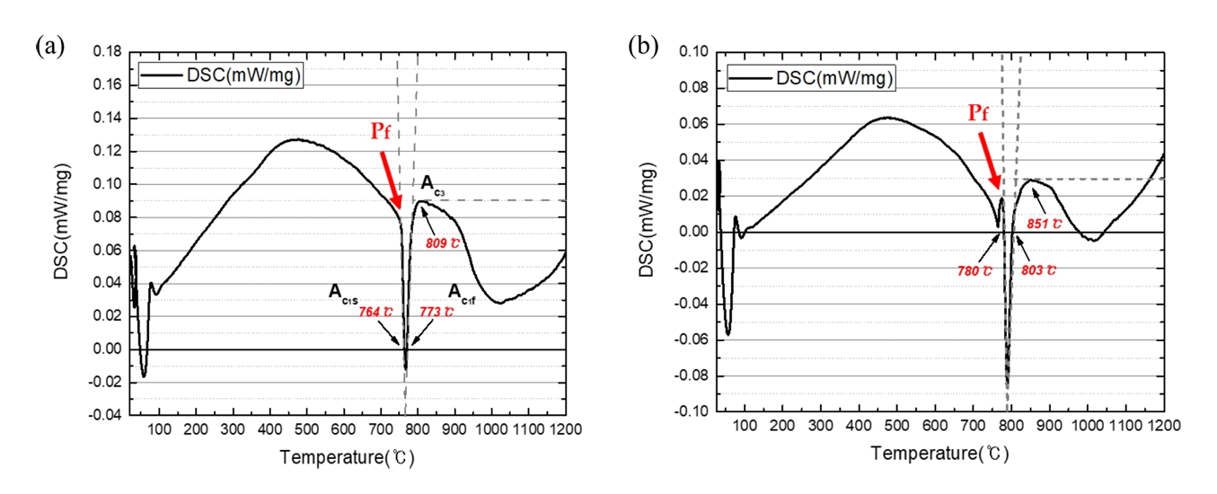 따라서 고온 시차주사열량(differential scanning calorimetry, DSC) 분석법을 이용하여 SCM 435와 개발강종의 Ac1과 Ac3 변태 온도를 확인하였으며 두 가지 열처리 조건을 설계하였다[26-28]. 분석에 사용된 DSC 장비는 Pegasus 社의 DSC 404 F1 모델이며 조건은 Ar 분위기 내 5°C/min의 승온 속도로 온도에 따른