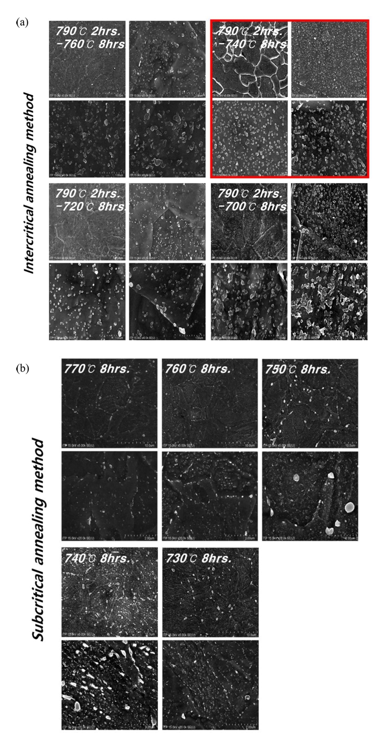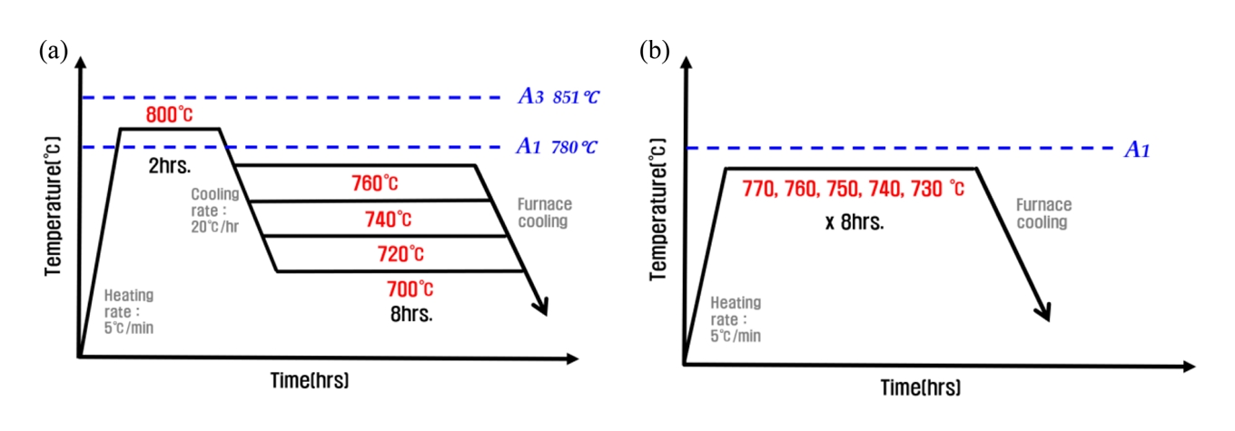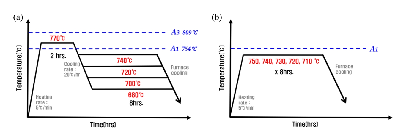 적용하였다. IA 조건 내 1차 가열구간의 온도는 Ac1 변태점보다 20°C 높은 온도로 설정하였고, 2차 가열구간의 온도는 20°C씩 낮춰가며 4가지 조건을 설정하였다[31]. SA 조건은 Ac1 직하에서 10°C씩 차이를 두어 어닐링 결과를 분석하였다. 또한, 조직 내 모든 상이 변태에 참여할 수 있도록 각 구간당 2시간, 8시간씩 충분한
