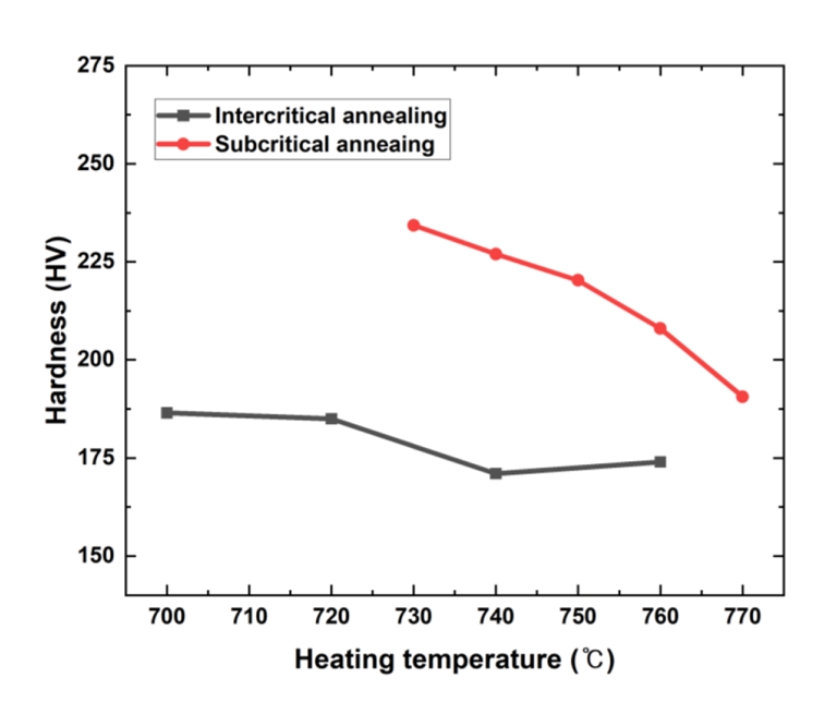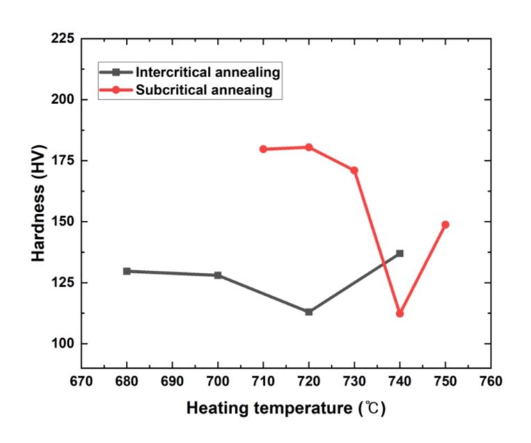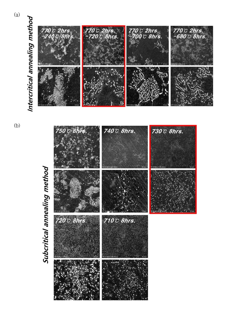 고르게 분산시킴으로써 경도를 낮추고 연성과 인성을 향상시켜, 후속 냉간 가공 공정에 적합한 기계적 특성을 확보할 수 있도록 한다. 일반적으로 Ac1과 Ac3 변태 온도 사이의 임계간 어닐링(intercritical annealing, IA) 또는 Ac1 이하의 아임계 어닐링(subcritical annealing, SA) 조건이 사용되며, 처리 온도, 유지 시간, 냉각 속도 등의 열처리 변수는 최종