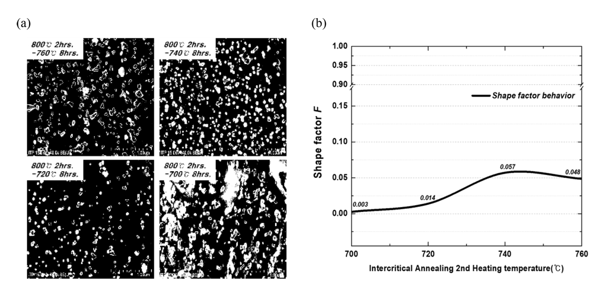 위 미세조직 분석 결과 중 개발강종의 IA 방법에 한하여 구상화율을 정량적으로 검증하기 위해 형상 인자(Shape factor) F를 이용하여 구상화율을