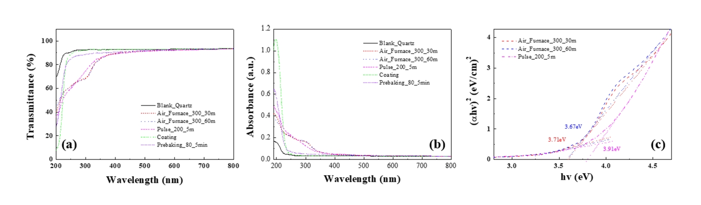 approximately 90% in the visible range. As shown in Fig 2 (b), both the air-furnace-annealed and pulsed UV-annealed films displayed strong absorption