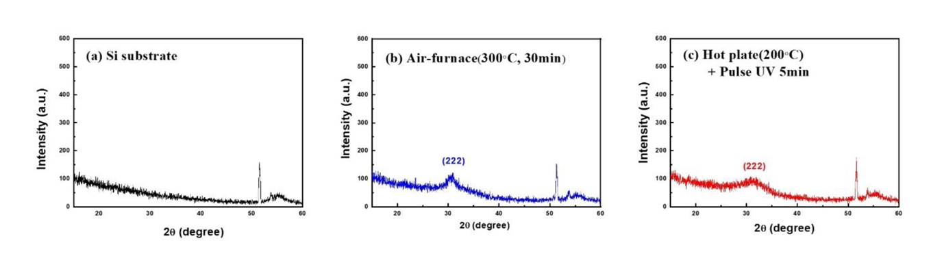 the UV-assisted annealed film (Fig 3 (c)), treated at a lower temperature of 200 °C for just 5 minutes, shows a weaker (222)