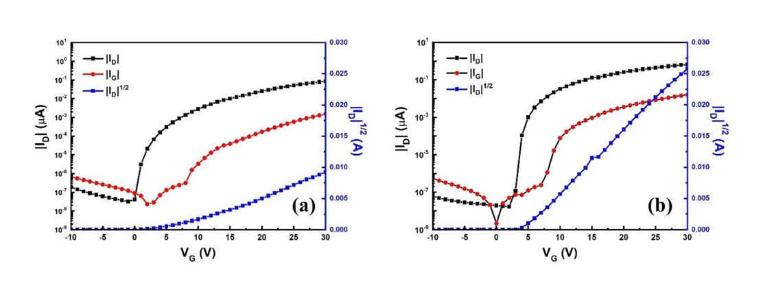 Table 1 summarizes the extracted electrical parameters of the fabricated In2O3 TFTs. The on/off current ratios (Ion/Ioff), derived from the ID–VG curves in Fig 8 (a, b), are approximately 2.67 × 106 and 3. 88 × 107, respectively. The threshold voltages (VTh), extracted by linear extrapolation of the √ID–VG curves, are 3.90 V and 4.74 V, respectively.