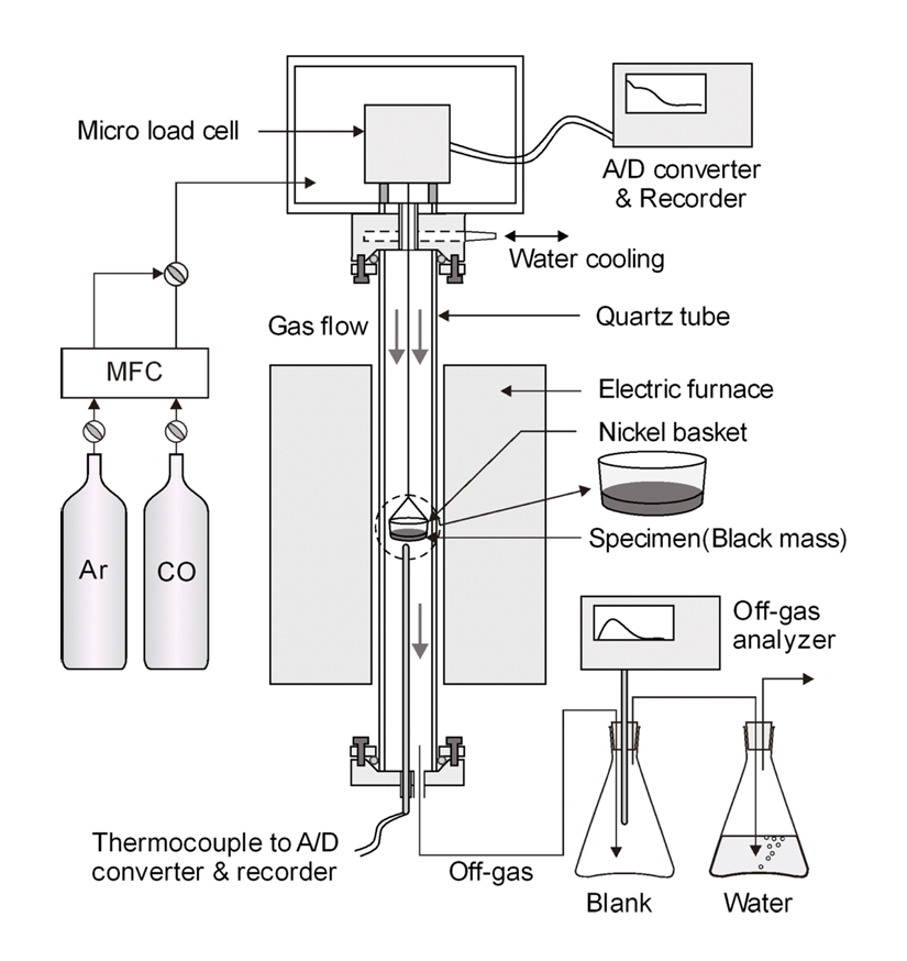 가스(Ar, Ar+50 vol.%CO)를 1,500 cm3/min로 불어 넣어 일정 시간 동안 반응시킨 후 Ar 가스 분위기 중에서 상온까지 냉각하여 시료를 회수하였다. 실험 전후 Ni 도가니의 무게 측정