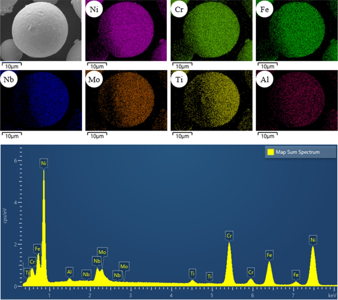 사용하여 분석한 결과, D90=30.4 μm로 나타났다. 그림 1에 도시한 바와 같이 Inconel 718 합금 분말들은 구형 형상을 보였으며, 에너지 분산 분광 분석(EDS, Oxford Instruments)