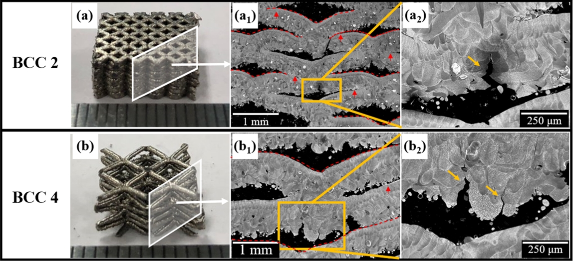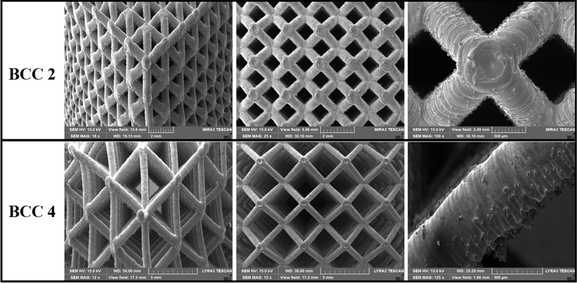 주목할 점은, BCC 2는 스트럿 간 간격이 더 좁았음에도 불구하고 고에너지 레이저 스캐닝에 기인한 뚜렷한 열 영향이 관찰되지 않았다는 것이다. 이는
