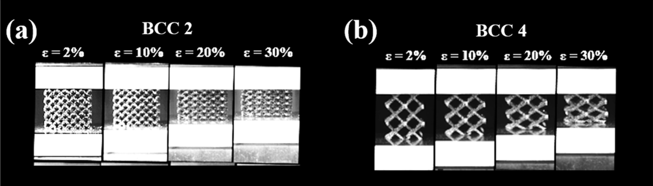 변형 시 BCC 2는 스트럿 좌굴이 시작되었고, 30%에서는 전체 구조가 붕괴되었다. 반면 BCC 4는 주로 스트럿 굽힘 변형이 우세하였으며, 30%