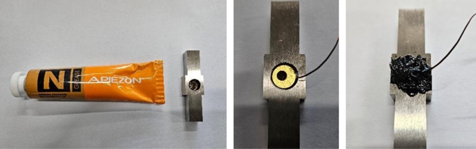 ธ์น ๋ฐ๋๋ฉด(์ํธํ๋ฉด)์ผ๋ก ๋ถํฐ ์ง๊ฒฝ ์ฝ ร9, ๊น์ด 5 mm ์ ๋์ ๊ตฌ๋ฉ์ ๊ฐ๊ณตํ์๋ค. ์ผ์์ ์ํธ ์ฌ์ด์ ์ด์ ๋์จ์ ๋์ด๊ธฐ ์ํด ๊ทน์ ์จ์ฉ ์ด์ ๋