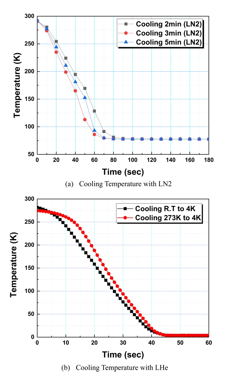 ๊ฐ๋ฐ๋ LHe ์ง์ ๋ถ์ฌ ๋๊ฐ์ฅ์น๋ ์งง์ ์๊ฐ(โ45์ด)์ ์ํธ์ ๊ท ์ผํ๊ฒ 4K๋ก ๋๊ฐ์์ผฐ์ผ๋ฉฐ, ์ต์ 2๋ถ ์ด์์ ๋ถ์ฌ๋ก ์ถฉ๋ถํ ๋๊ฐ ํจ๊ณผ๋ฅผ ์ป์๋ค.