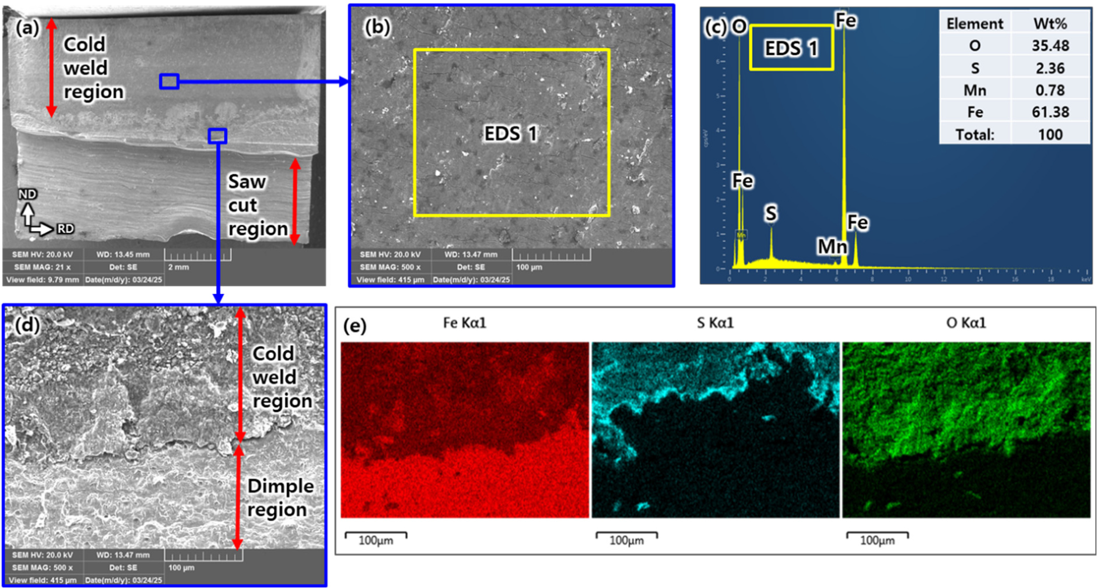 results of cold weld region, (d) SEM image of boundary between cold weld region and