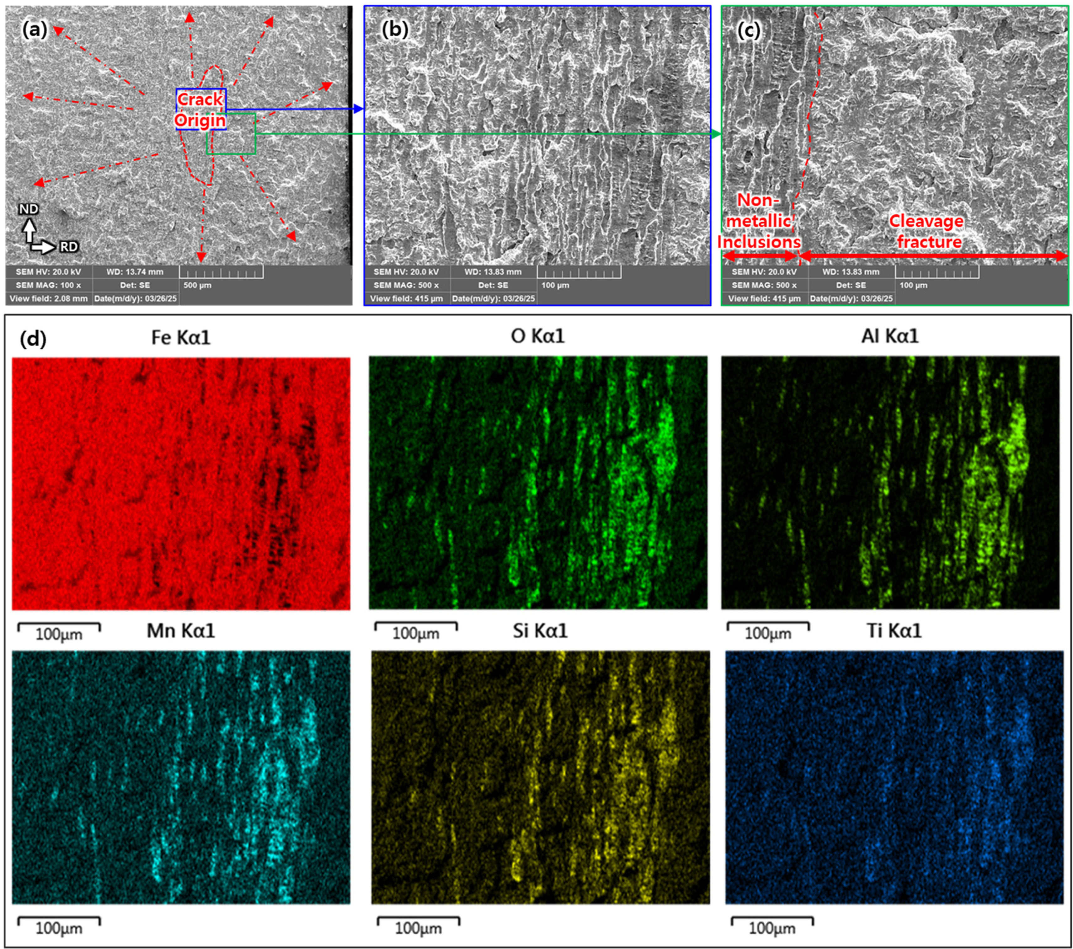 origin, (b) SEM image of welding inclusion at the crack origin, (c) SEM image on the