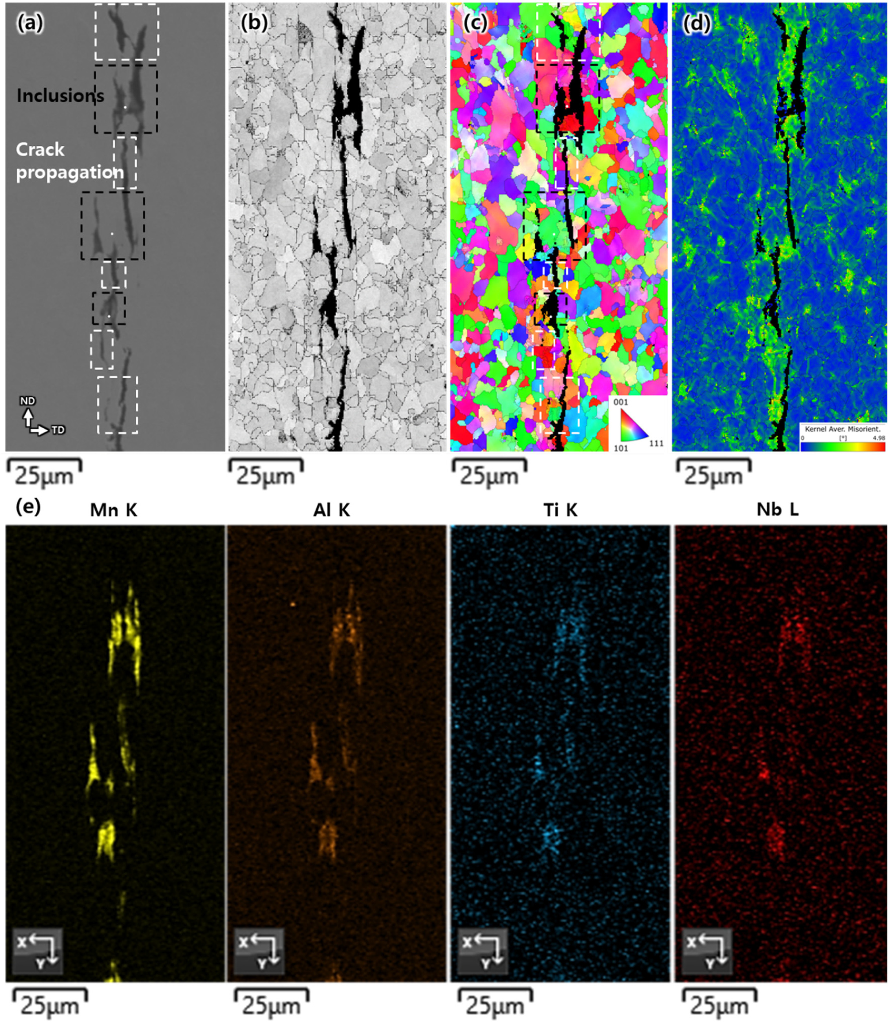 그림 8에는 가장 넓은 영역에 균열이 발생된 #8(364kW)조건에서 균열 기점 주변의 균열 전파 영역에 대한 EBSD 분석 결과를 나타내었다. 그림 8(a)에 균열이 발생된 영역의 SEM 사진을 나타내었으며, 본드라인을 따라 ND 방향으로 길게 균열이 발생되었다. 그림 8(e)에 EDS map 분석 결과를 나타내었으며, 20 ㎛ 내외의 미세 산화물이 본드라인을 따라 불연속적으로 분포된 것을 확인할 수 있다. 그림 8(a)의 SEM 사진과 (e)의 EDS map 분석 결과를 비교하여 그림 8(a)에 산화물이 잔존된 영역(검정색 점선)과 균열이 전파된 영역(흰색 점선)을 구분하여 나타내었다. 그림 8(c)에는 IPF map을 나타내었으며, 균열이 입계를 따라 불연속적으로 분포된 산화물들의 사이 구간에서 발생되고, 균열 전파는 입계 전파와 입내 전파가