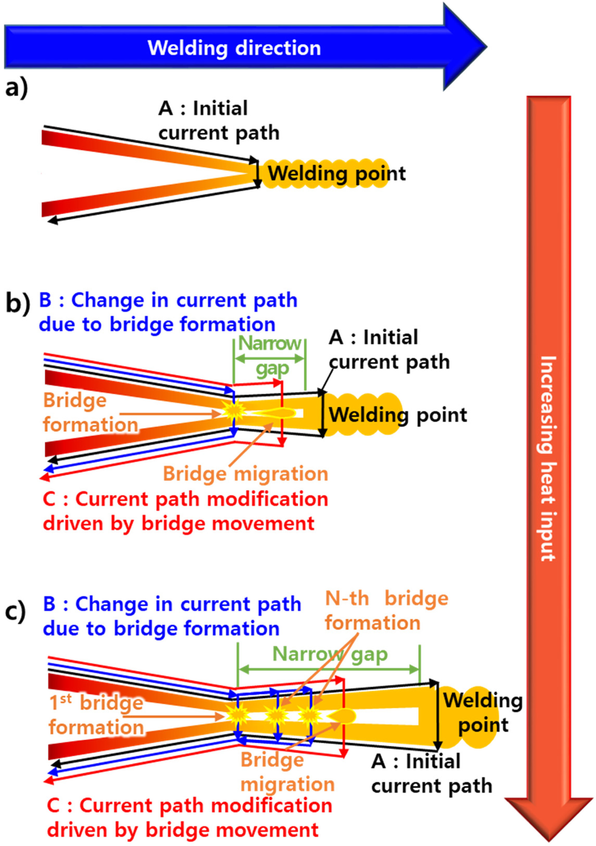 생성됨에 따라 B(파란색 화살표)와 같이 전류의 경로가 급격히 변화된 후, 브릿지가 용접 지점으로 이동함에 따라 전류 경로도 C(빨간색 화살표)와