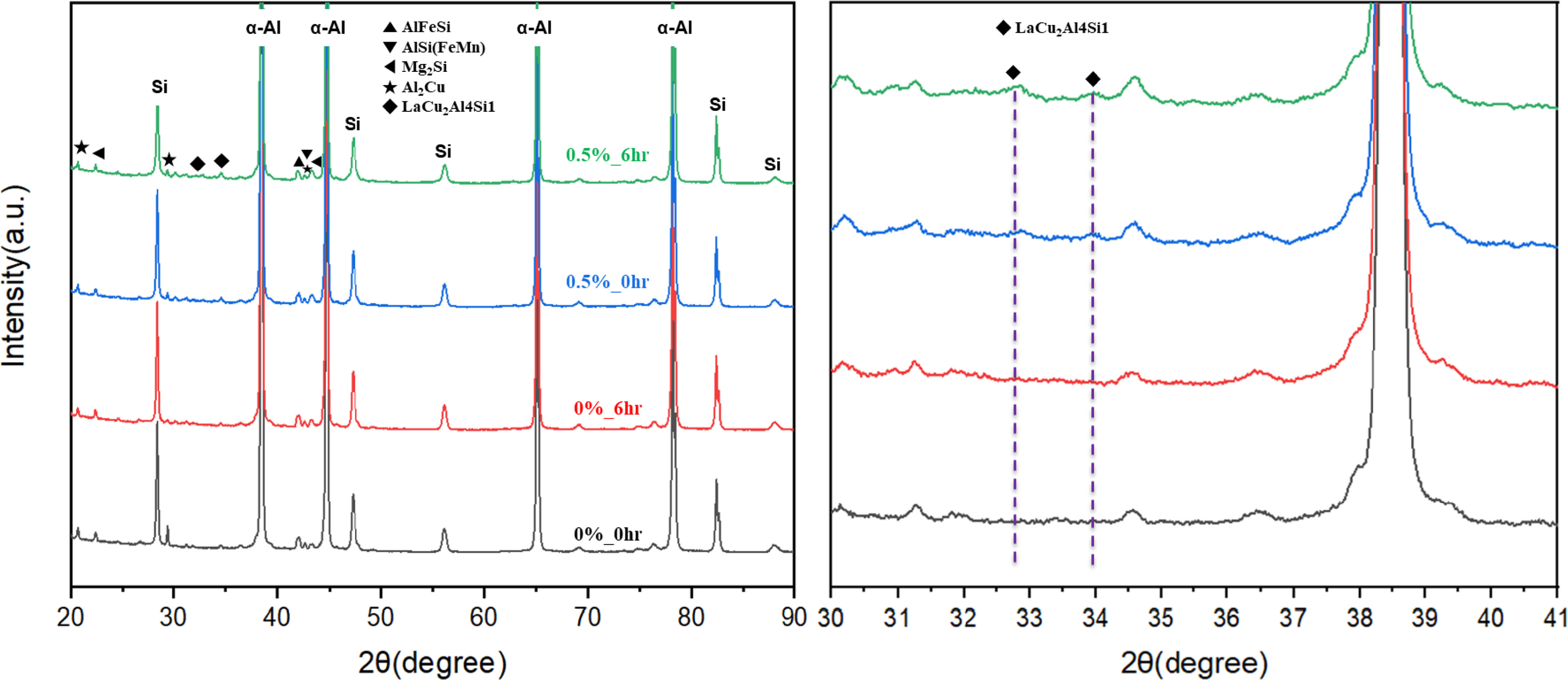 ๋ชจ๋ ์ํธ์์ ฮฑ-Al๊ณผ Si ํผํฌ๊ฐ ๊ณตํต์ ์ผ๋ก ๊ด์ฐฐ๋์์ผ๋ฉฐ, Mg2Si ๋ฐ Al2Cu ๋ฑ ๊ธฐ์กด์ ์ฃผ์กฐํฉ๊ธ์์ ํ์ฑ๋๋ phase๋ ๊ฒ์ถ๋์๋ค. La์ด ์ฒจ๊ฐ๋ ์ํธ์์๋ ์ฝ 33~34ยฐ ๋ถ๊ทผ์์ ์ ๊ท ํผํฌ๊ฐ ์ถ๊ฐ๋ก ๊ด์ฐฐ๋์์ผ๋ฉฐ,