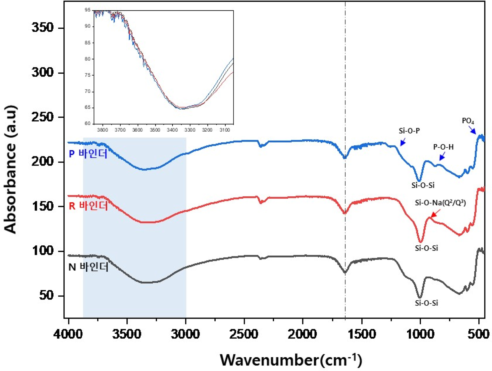 strerch/H2O bend ๋น์จ์ ๊ฐ์ง๋ฉฐ, Si-O-Na ๋๋ Si-O-P ๊ฒฐํฉ์ ๊ฐ์ง๊ณ ์๋ ๊ฒ์ ํ์ธํ์๋ค.