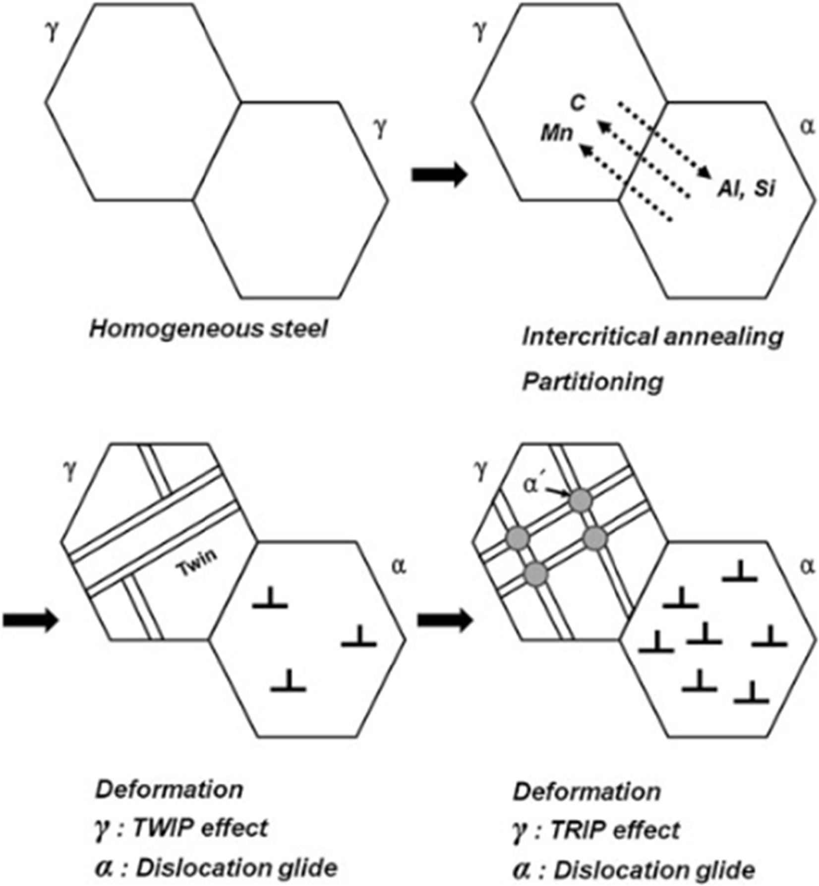 이는 고온이나 고응력 조건에서 더욱 두드러지며, TWIP 메커니즘은 망간의 함량에 밀접하게 연결되어 있다. TRIP 메커니즘은 변형 과정에서 오스테나이트