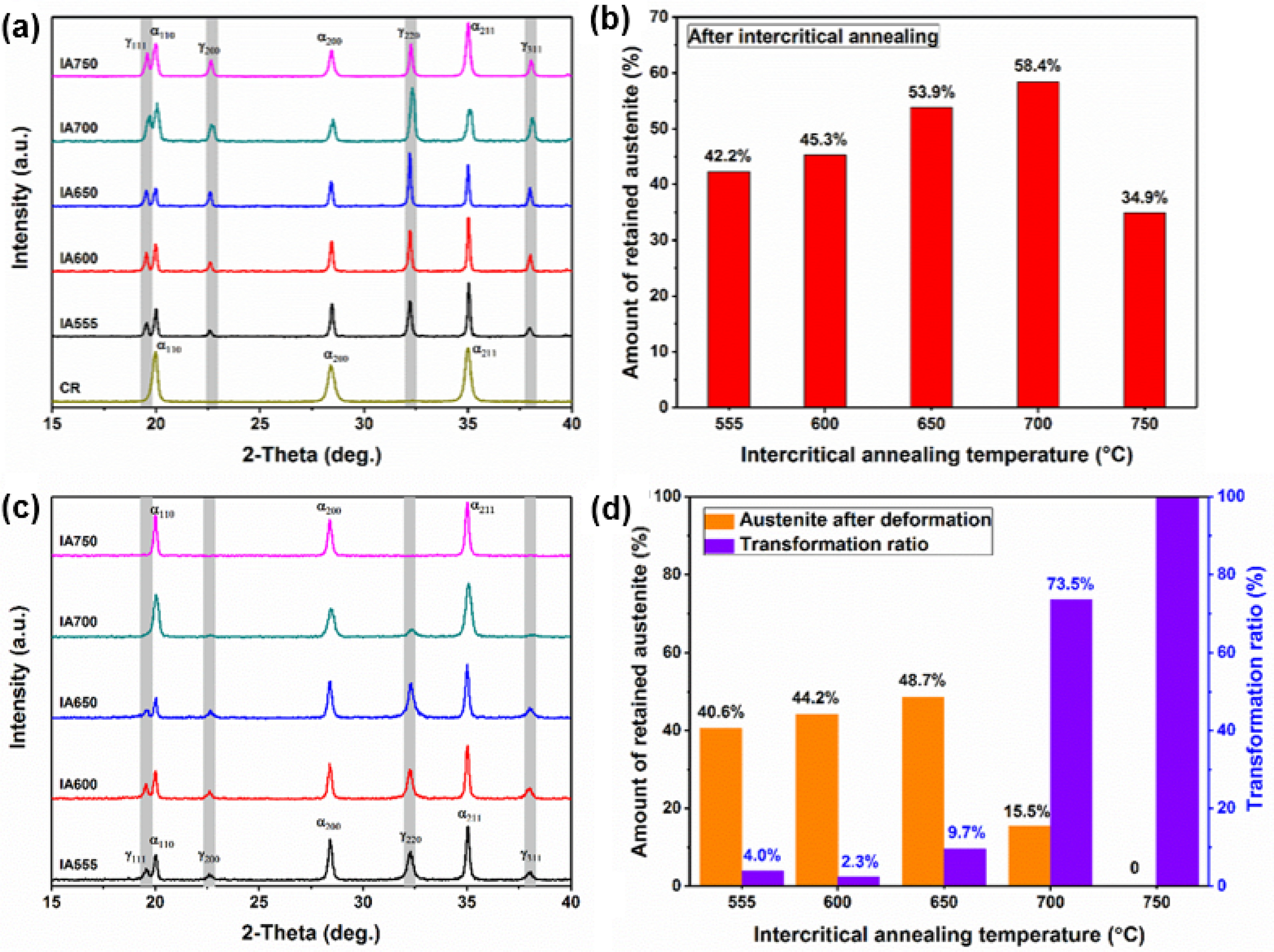 Effect of intercritical annealing temperature on (c) austenite fractions and (d) mechanical