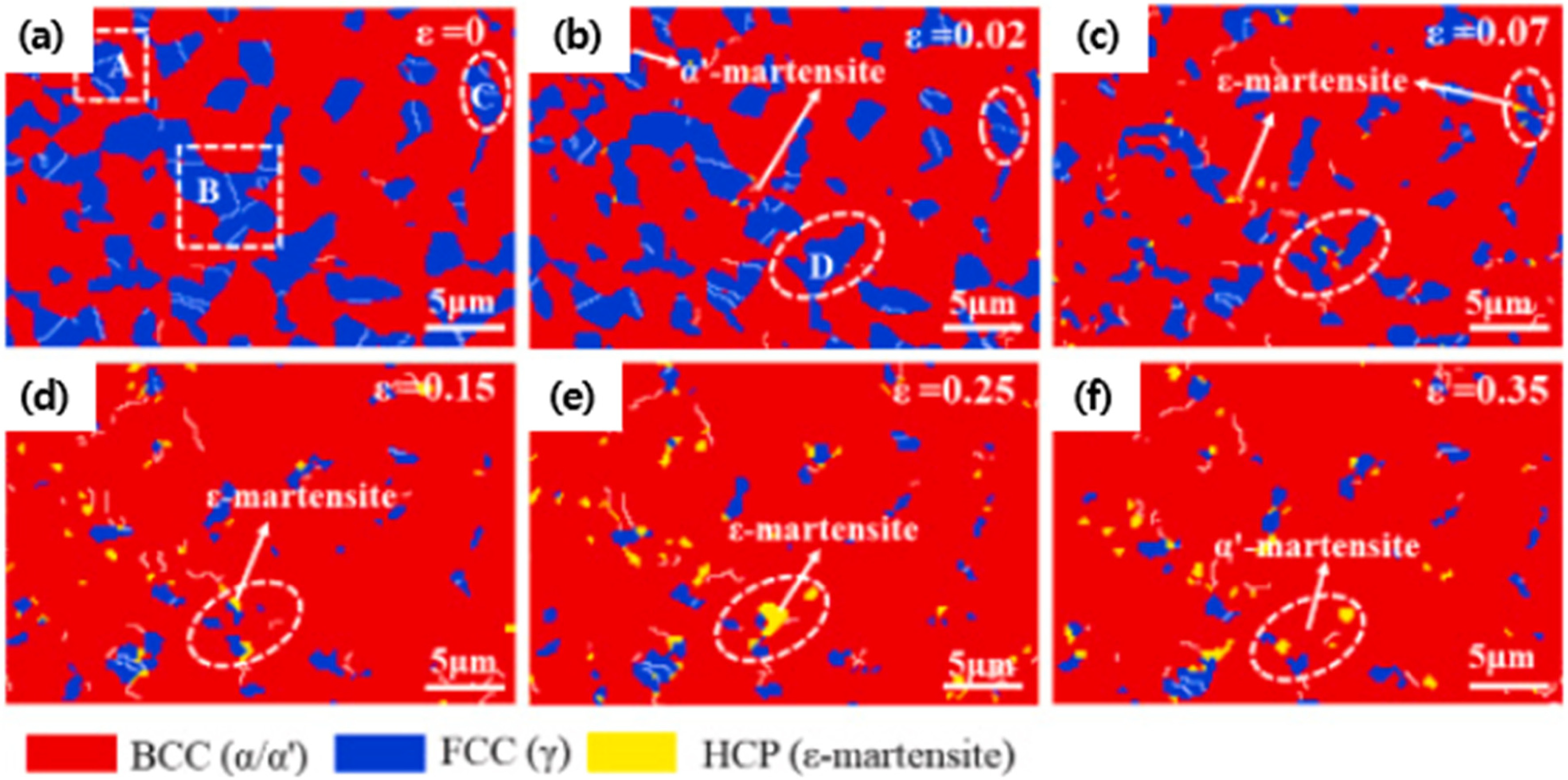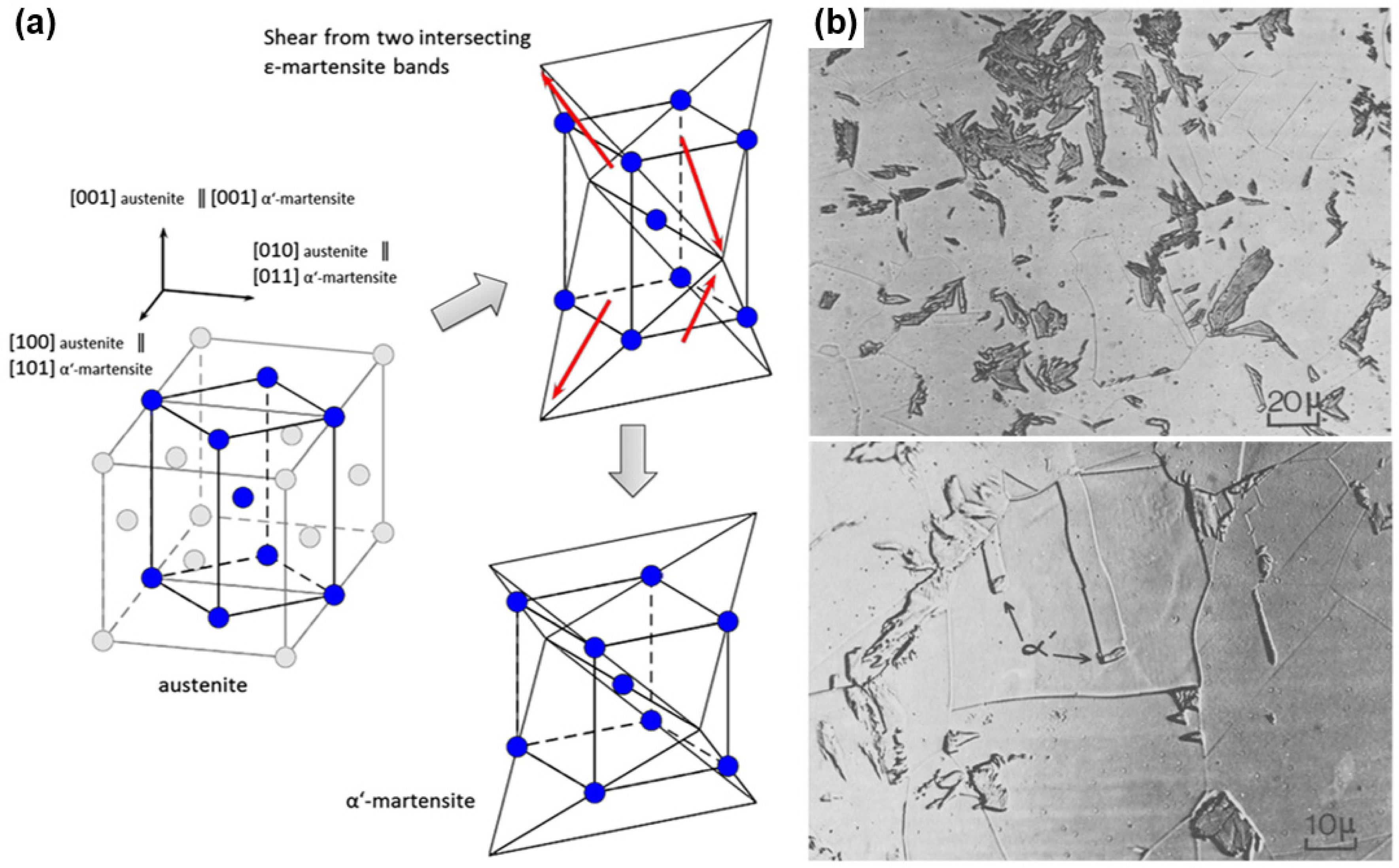 (b) α‘-martensite formed along twins and grain boundaries by plastic deformation[38].