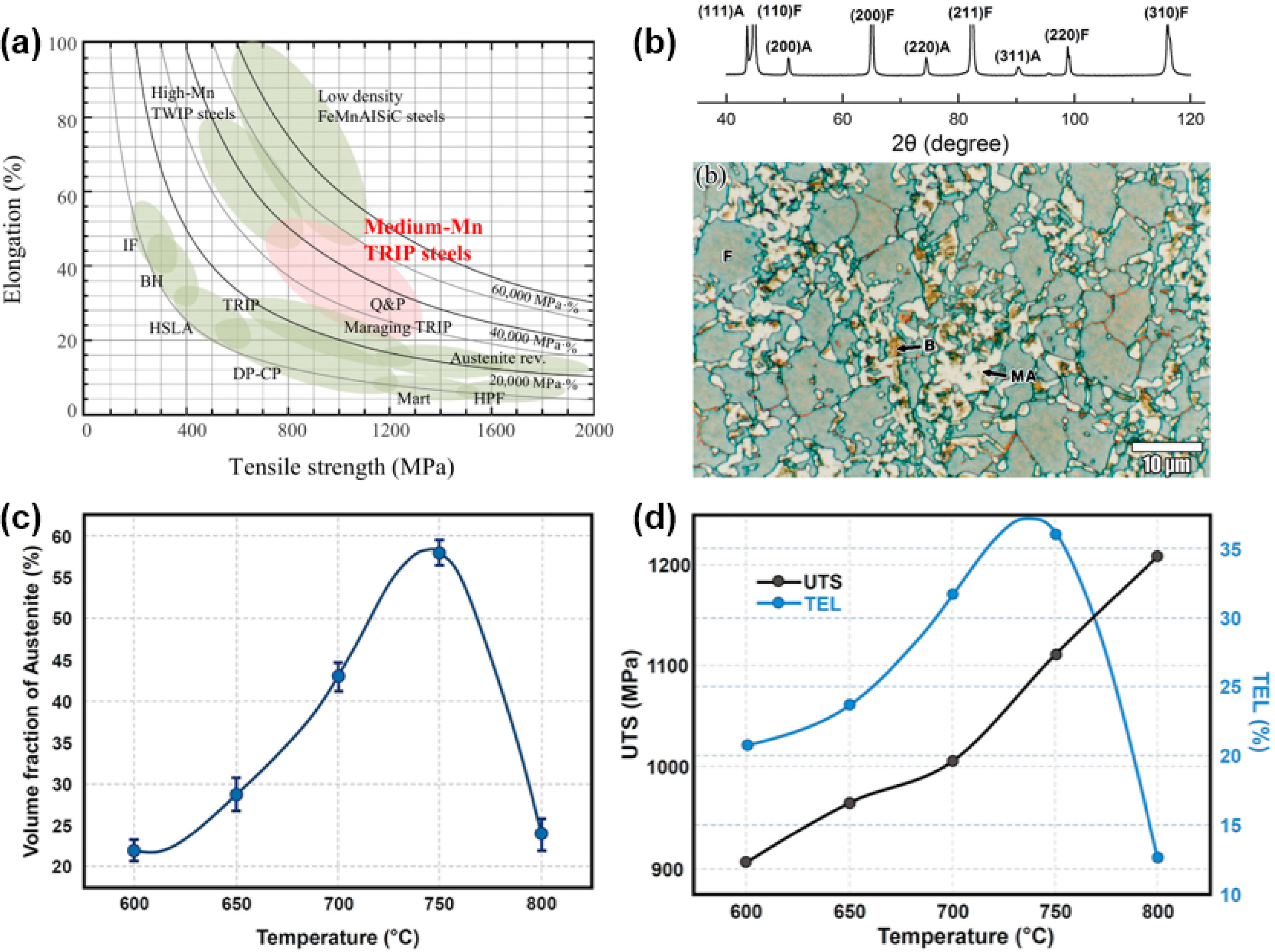 for automotive steels[42], (b) XRD pattern and typical microstructure of TRIP steels