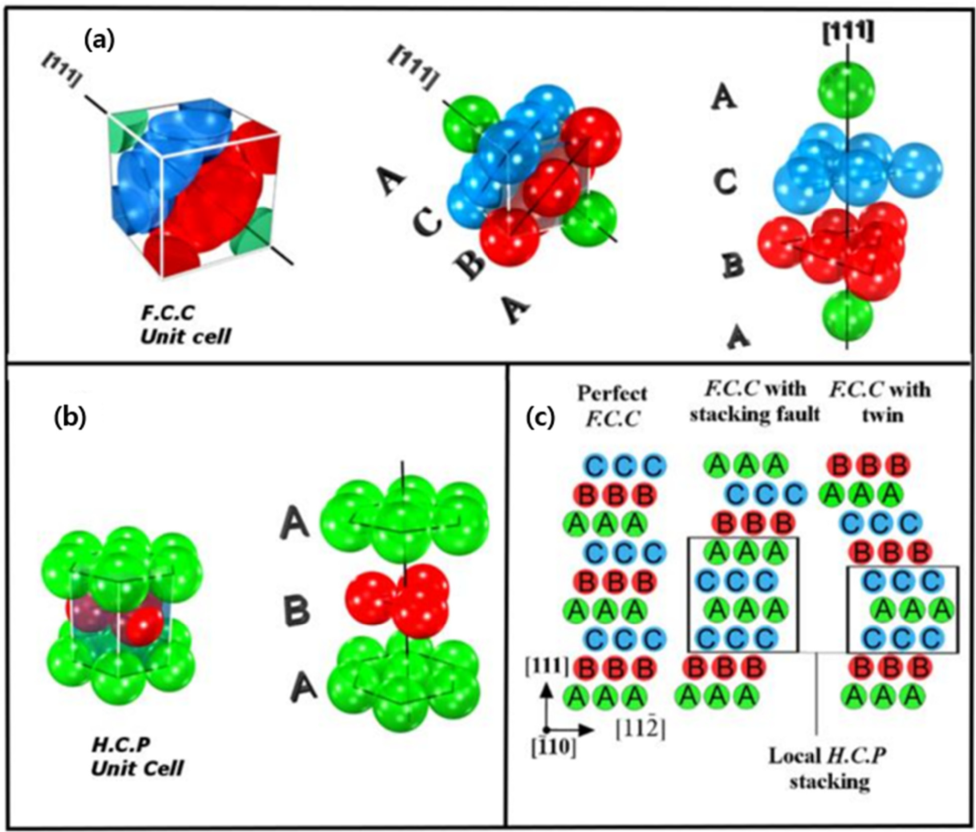 the sequence for a f.c.c. structure, (b) h.c.p. structure, and (c) f.c.c. to h.c.p.