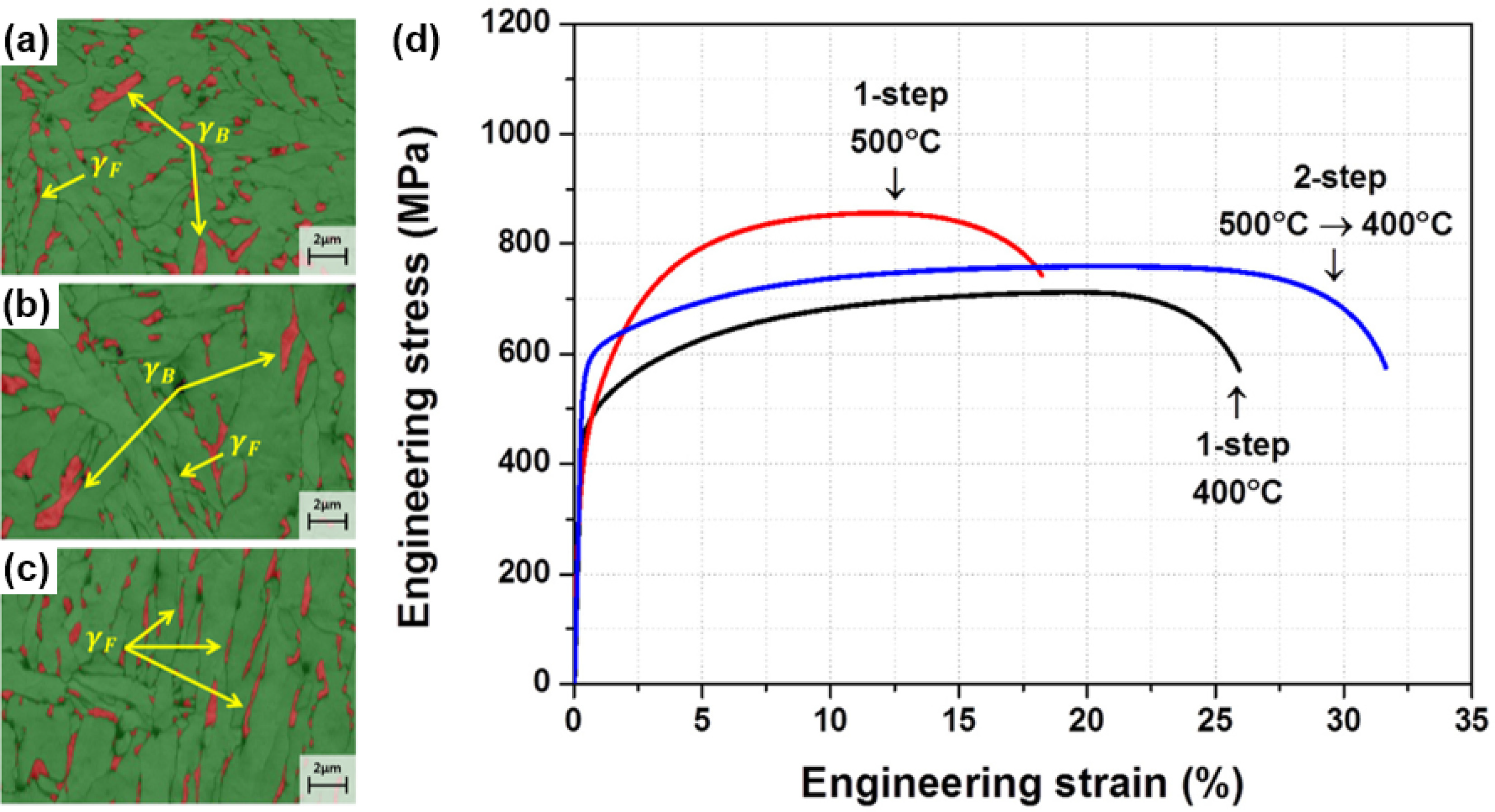 γB: blocky retained austenite, γF: film-like austenite). (d) Engineering stress-strain