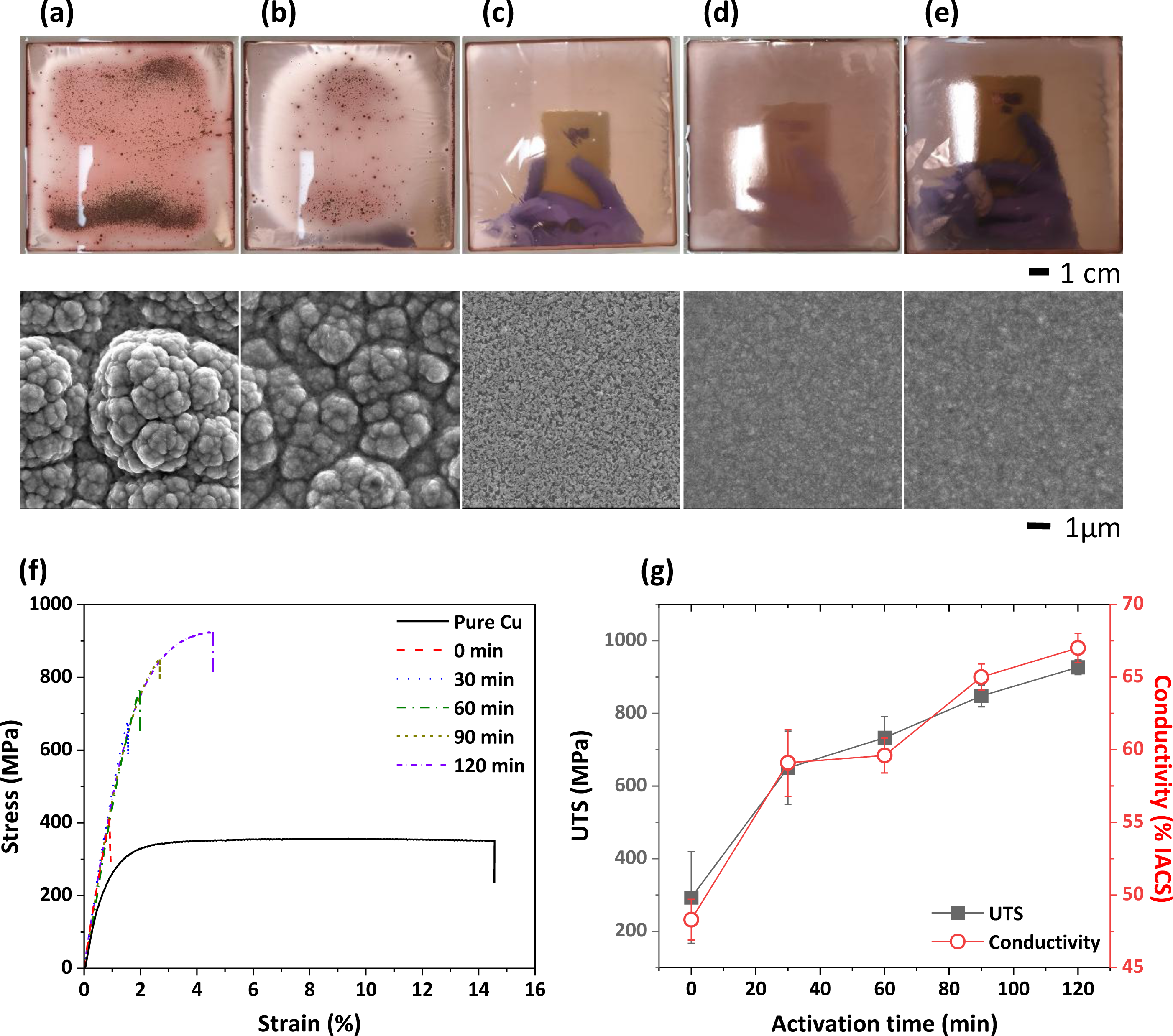 curves and (g) ultimate tensile strength (UTS) and electrical conductivity of the
