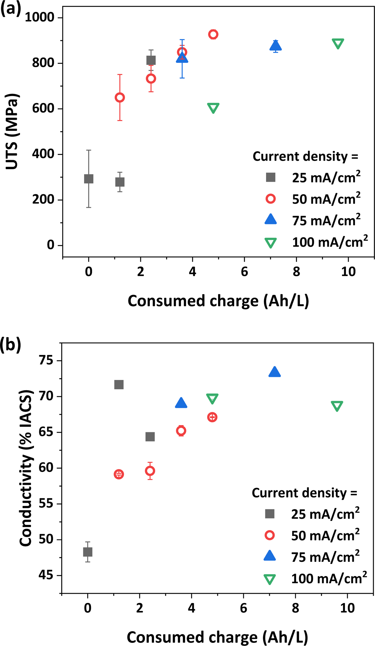 Fig. 3. (a) UTS and (b) electrical conductivity of CuAg foils obtained from non-activated