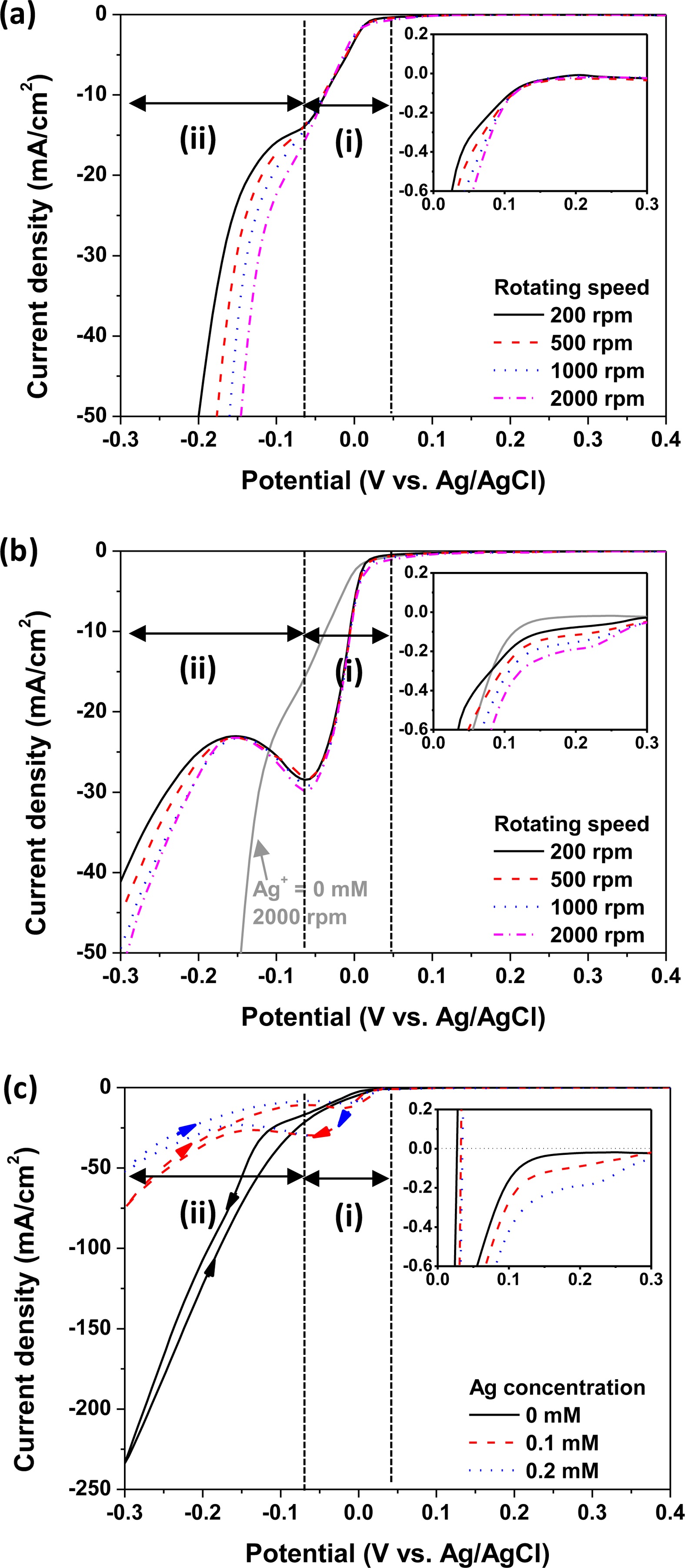 with various Ag+ concentrations show two characteristic redox processes (Ag+/Ag0 and Cu2+/Cu0) in a potential range of 0–0.6V (vs. Ag/AgCl). As shown in the inset of Fig. 4(a), the limiting currents associated with the reduction of Ag+ to Ag0 appear between 0.15 V and 0.25 V. The limiting current density (obtained at 0.2 V)