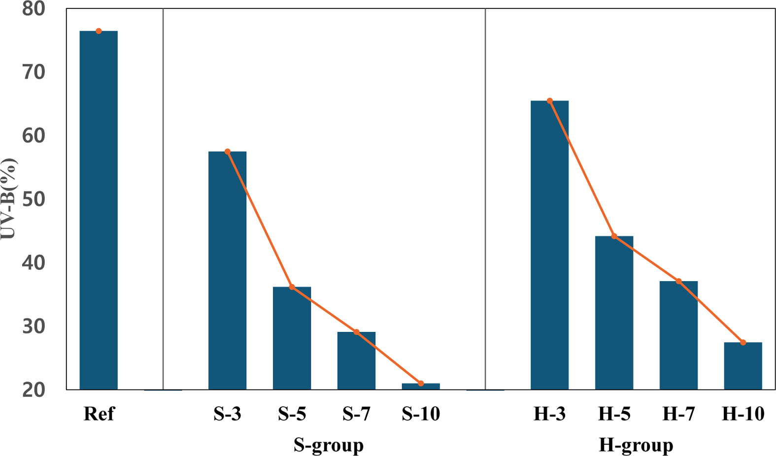 UV-B transmittance decreased as TiO2 loading increased. The sol-gel (S) group consistently showed lower transmittance