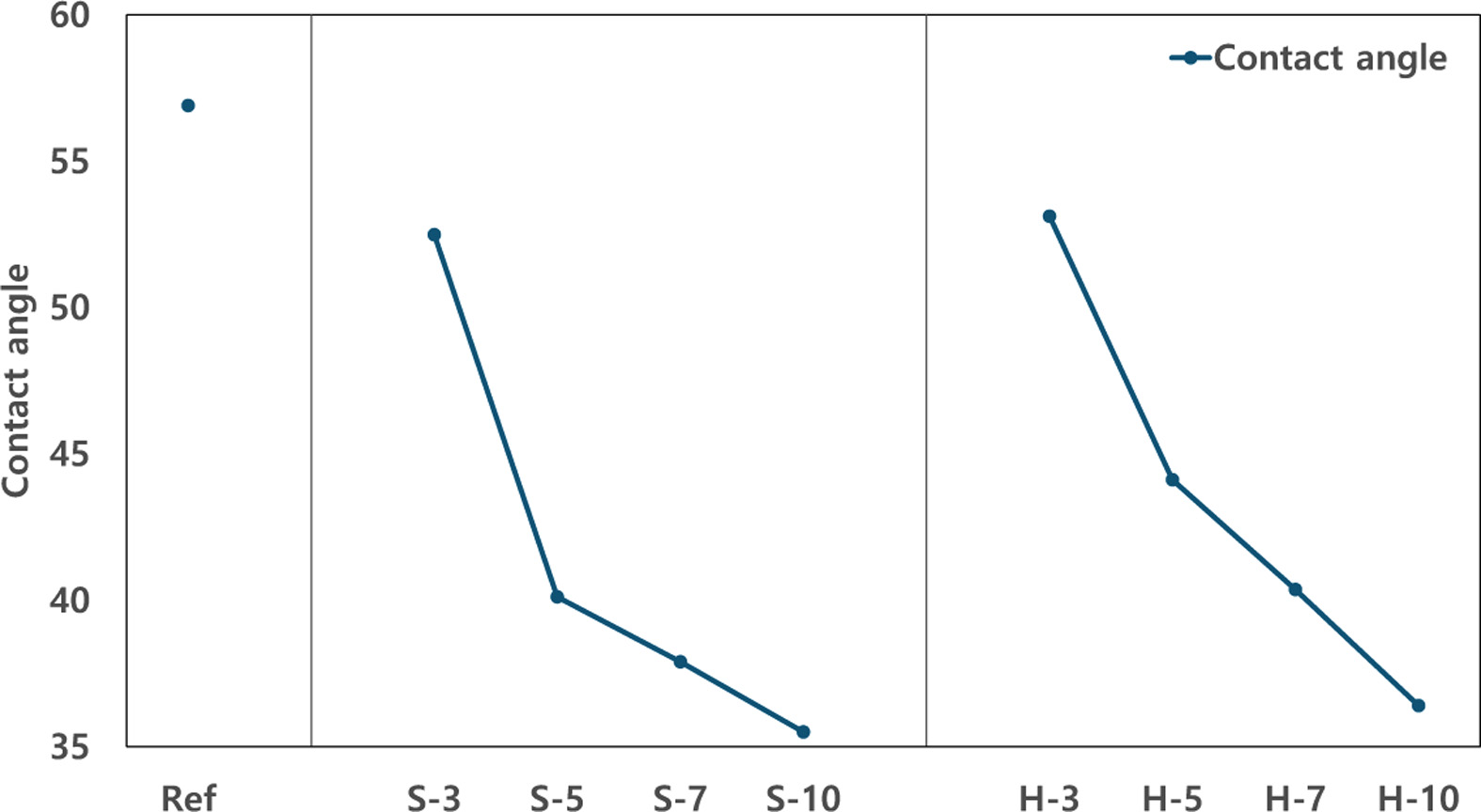 was ~56.9°, S-10 ~35.5°, and H-10 ~36.4°. The S-group values were typically 1-4° lower