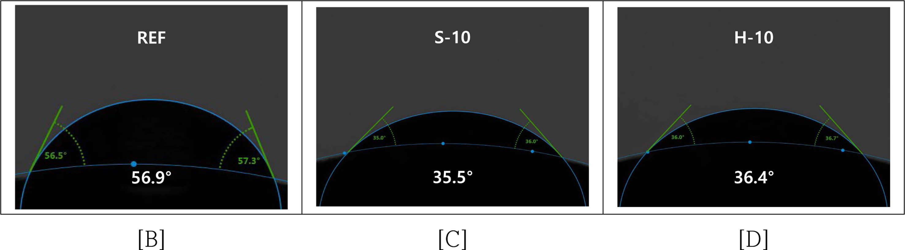 Fig. 4. Contact angle images and samples comparison. ([A]: Ref, [B]: S-10, [C]: H-10).