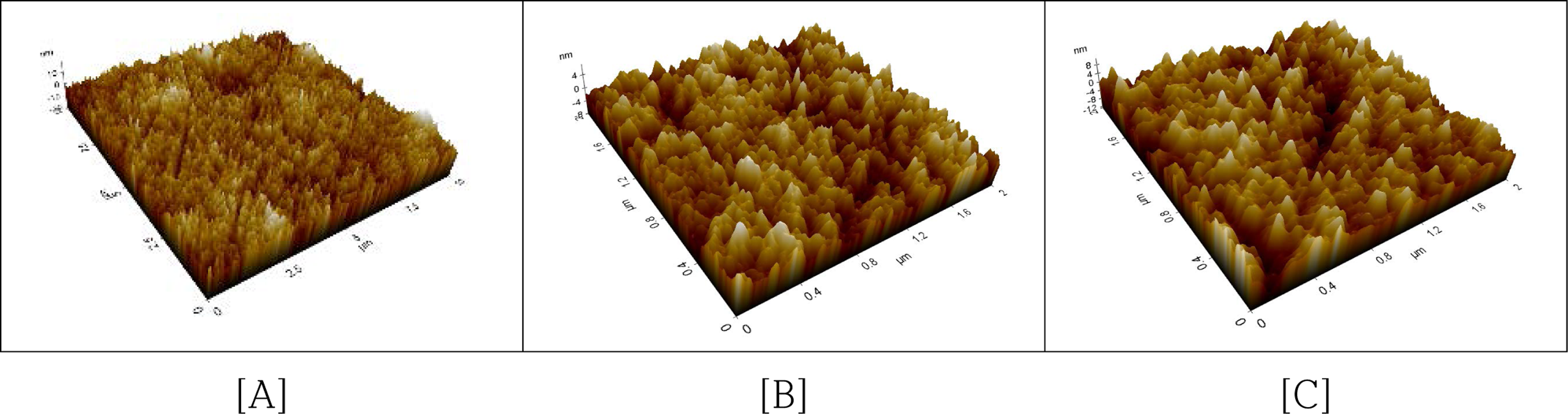 Fig. 6. AFM images of samples. ([A]: Ref, [B]: S-10, [C]: H-10).