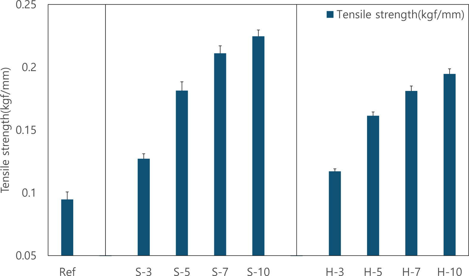 The tensile strength increased consistently with TiO2 addition and the S group exceeded the H group by ~0.010–0.030 kgf/mm at the same