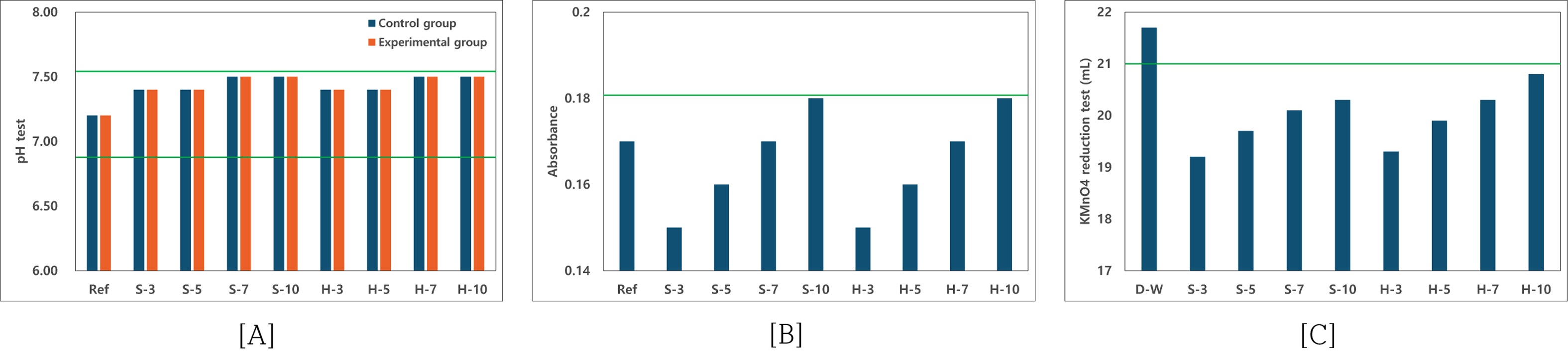 Fig. 8. Elution test of samples. ([A]: pH test, [B]: Absorbance, [C]: KMnO4 reduction test).
