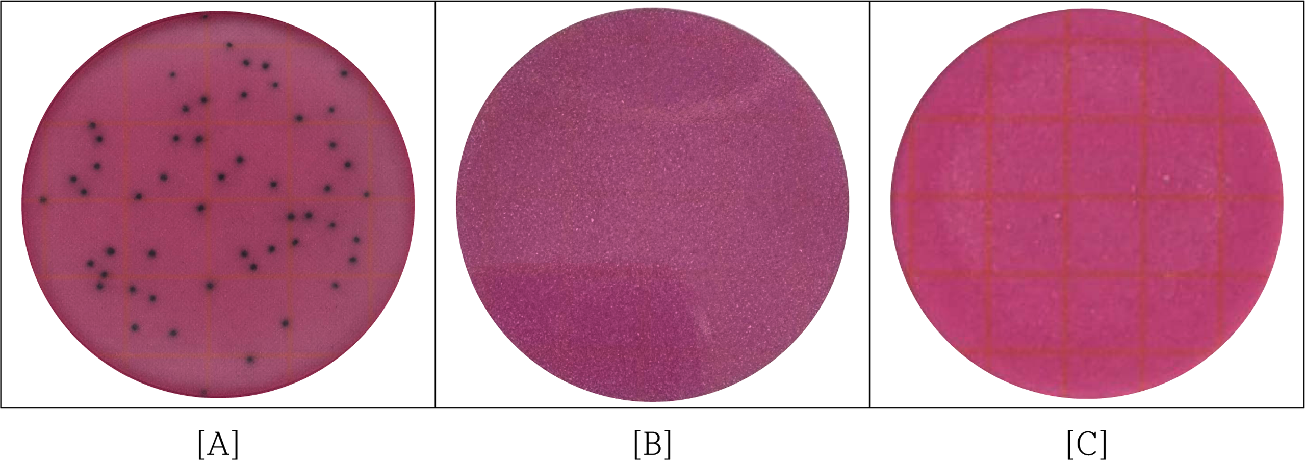 Ref showed numerous dense, dot-like colonies of Escherichia coli across the grid,