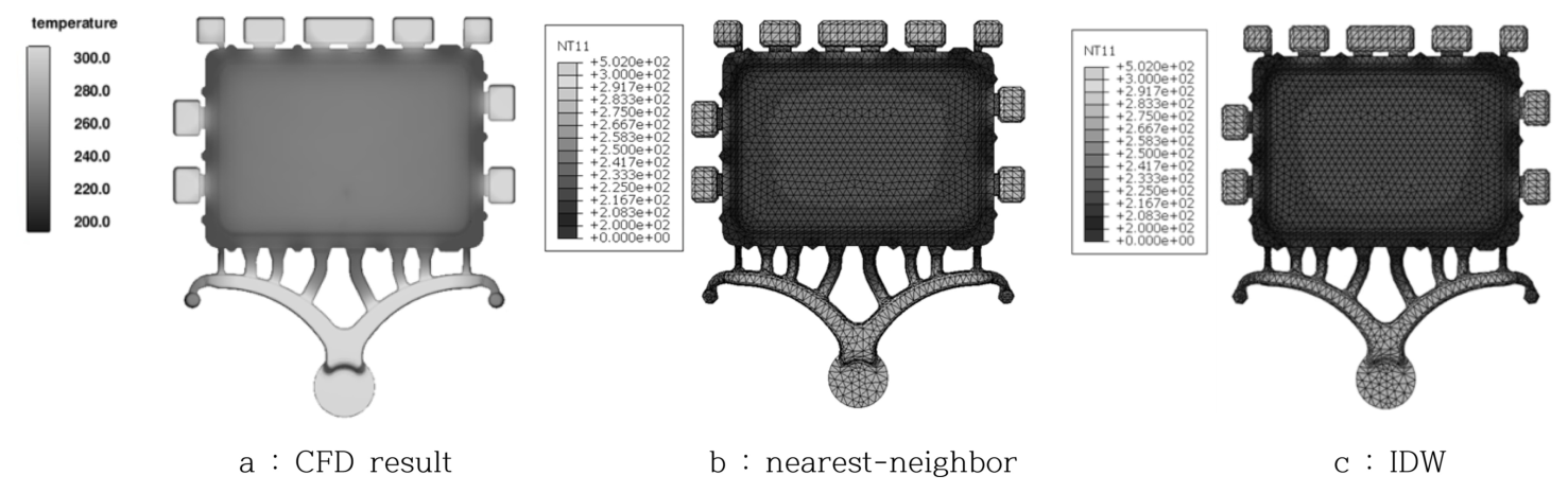 따라서 본 연구에서는 CFD 해석으로 얻어진 ADC12 고압 다이캐스팅 공정의 3차원 온도 데이터를 구조해석 격자에 전달하기 위해 IDW 기반의 온도장