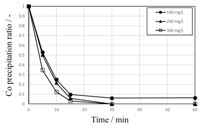 Fig. 5. Precipitation behavior of Co during cementation tests with 10 g of Zn powder