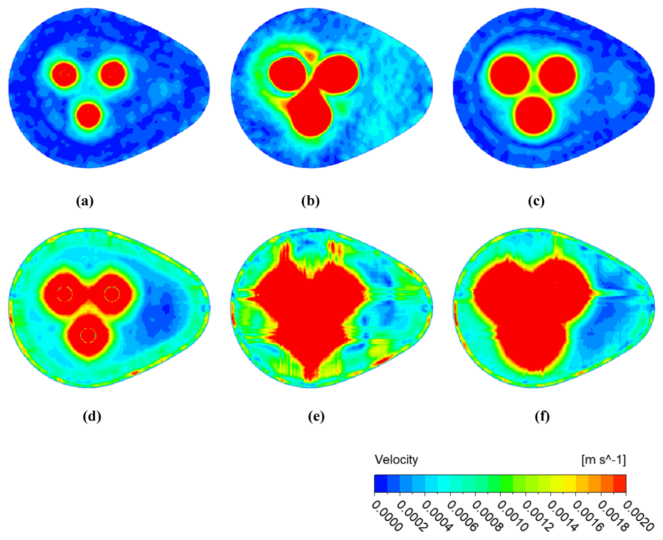 명확히 구분할 수 있도록 0~0.005 m/s 범위로 조정하였다. 전체 유동 패턴은 기포가 생성되는 노즐의 상부에서 상승 유동이 우세하며, 노즐로부터