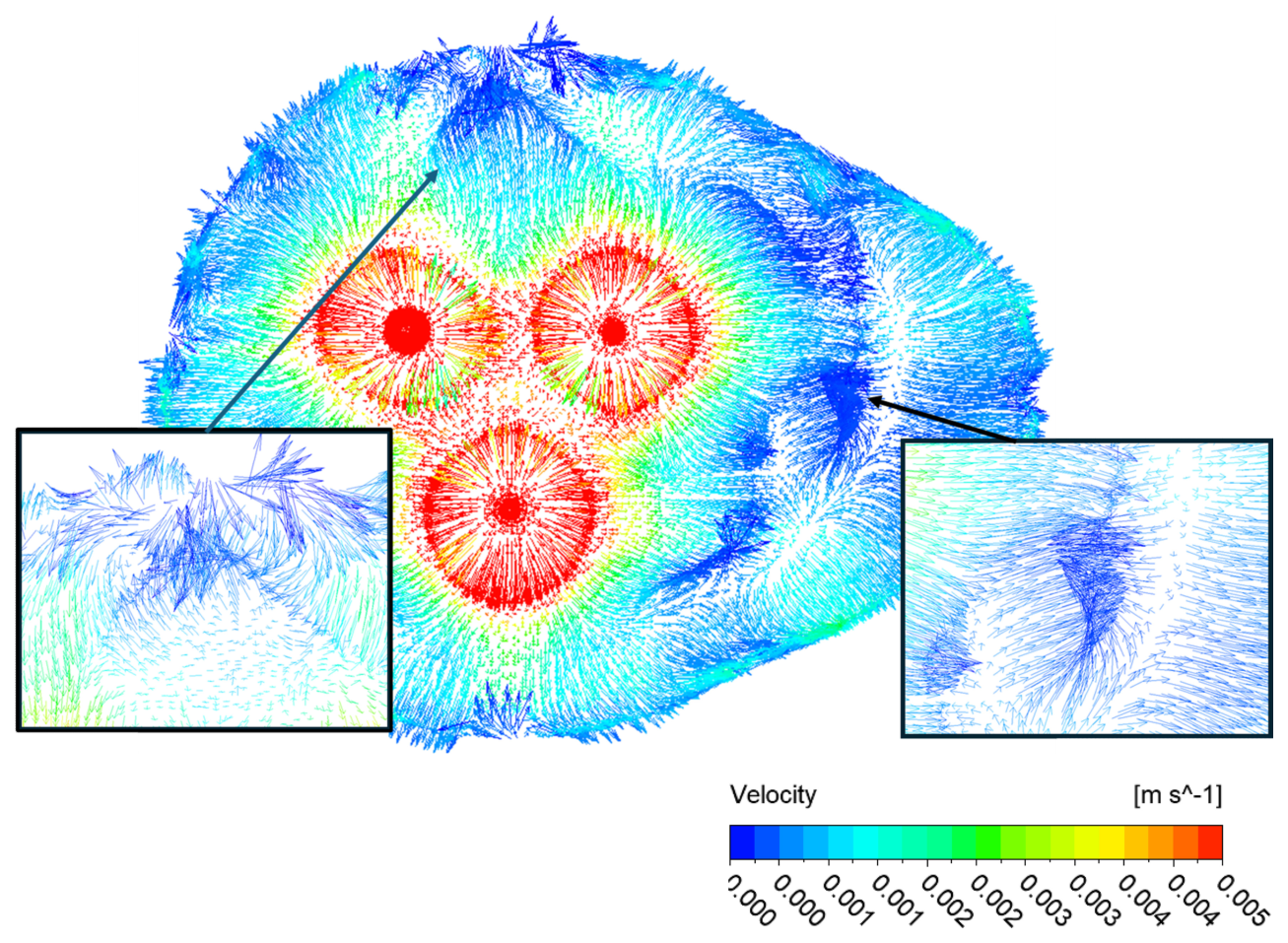 Fig. 9. Velocity vectors for the 300 NL/min condition, which exhibits the lowest dead-zone